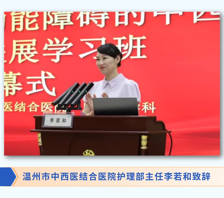 為進(jìn)一步促進(jìn)中西醫(yī)結(jié)合護(hù)理在腦卒中后認(rèn)知功能障礙康復(fù)中的應(yīng)用發(fā)展,8月10日,溫州市中西醫(yī)結(jié)合醫(yī)院成功舉辦“腦卒中后認(rèn)知障礙的中西醫(yī)護(hù)理新進(jìn)展”培訓(xùn)班,溫州市中西醫(yī)結(jié)合醫(yī)院護(hù)理部主任李若和出席會議并致辭。