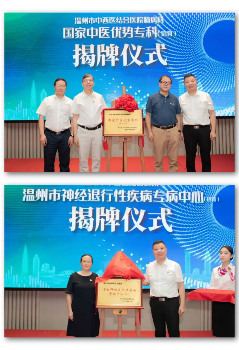 現(xiàn)場舉行了國家中醫(yī)優(yōu)勢??啤X病科揭牌儀式和溫州市中西醫(yī)結(jié)合醫(yī)院神經(jīng)退行性疾病專病中心揭牌儀式,標(biāo)志著溫州市中西醫(yī)結(jié)合醫(yī)院腦病學(xué)科發(fā)展開創(chuàng)新局面、邁入新階段。